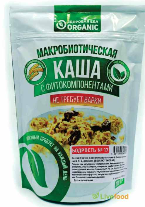 Макробиотическая Каша ORGANIC с фитокомпонентами №17 "Бодрость" полезна для ежедневного питания. Благоприятно воздействует при аллергии различных форм, атеросклерозе, ожирении, диабете II типа, заболевании поджелудочной железы. Элементы P, Fe, Ca, Mn способствуют кроветворному процессу. Улучшается состояние кожи, снижается риск возникновения инфарктов, инсультов, ишемии сердца, гипертонии. Повышает защитные функции.