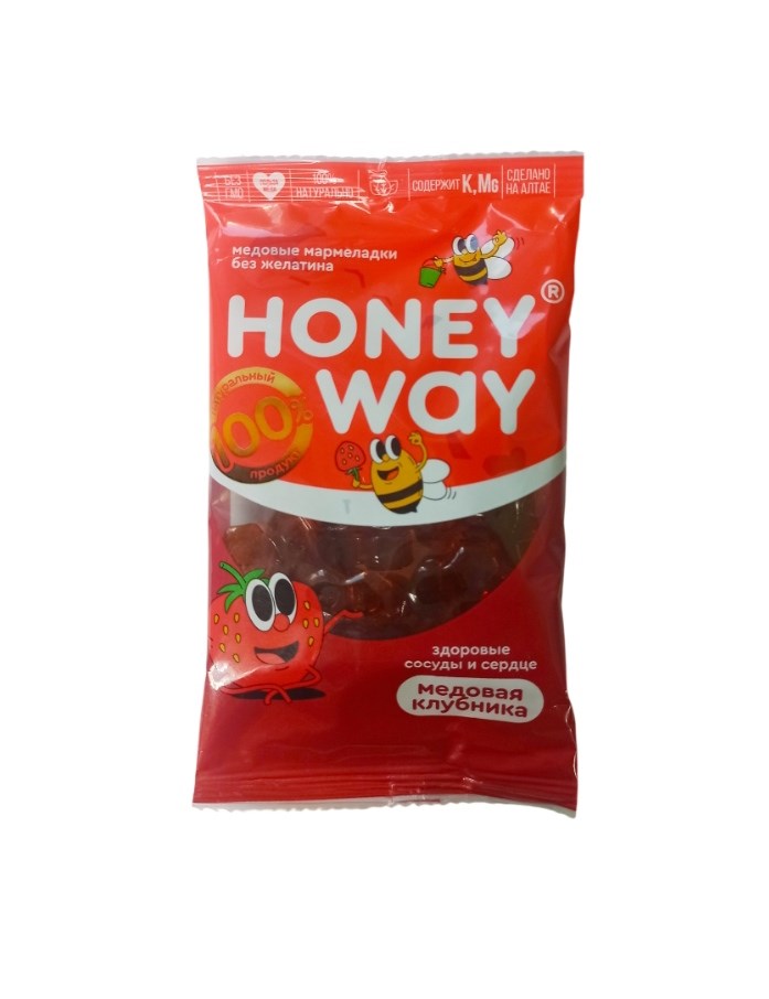 Состав: мед, сироп топинамбура, тростниковый сахар, концетрированный яблочный сок, сок клубники, пектин, лимонная кислота, аскорбиновая кислота, натуральный ароматизатор (клубника), натуральный краситель (овощной сок), кокосовое масло, воск пчелиный.